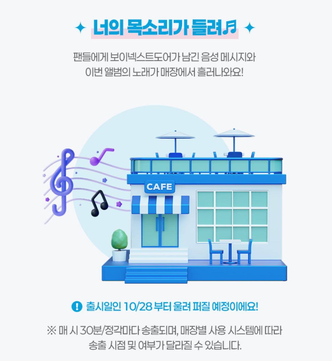 - 보이넥스트도어 신곡 + 음성 메시지 매장 송출
