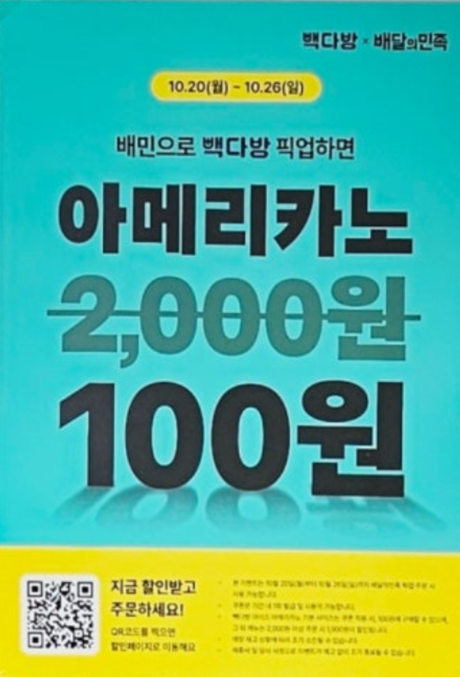 배달의민족 × 빽다방 콜라보! 아메리카노 100원 이벤트 (10월 26일까지)